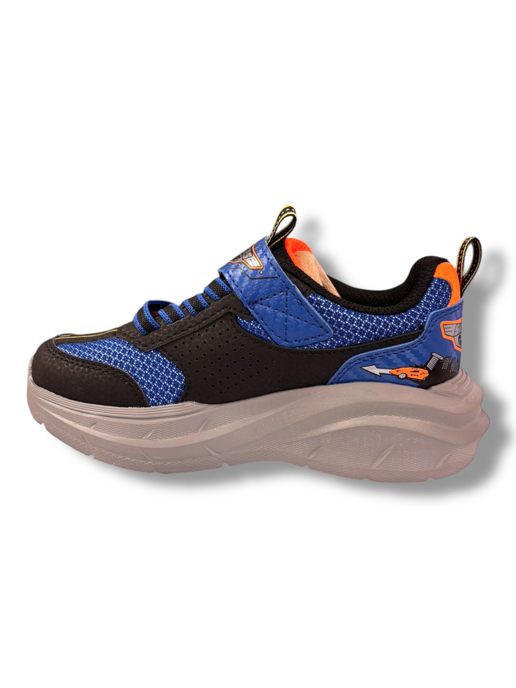 Start your little one's engines with plenty of fun wearing Skechers Garage Boys Runner! This lightweight Skechers Velcro closure runner features a mesh and synthetic overlay upper with eye-catching car themed graphics, elastic stretch laces, and an adjustable instep strap. This playful design is complete with a sliding garage on the midsole and includes two toy cars that can be stored inside the shoe!
