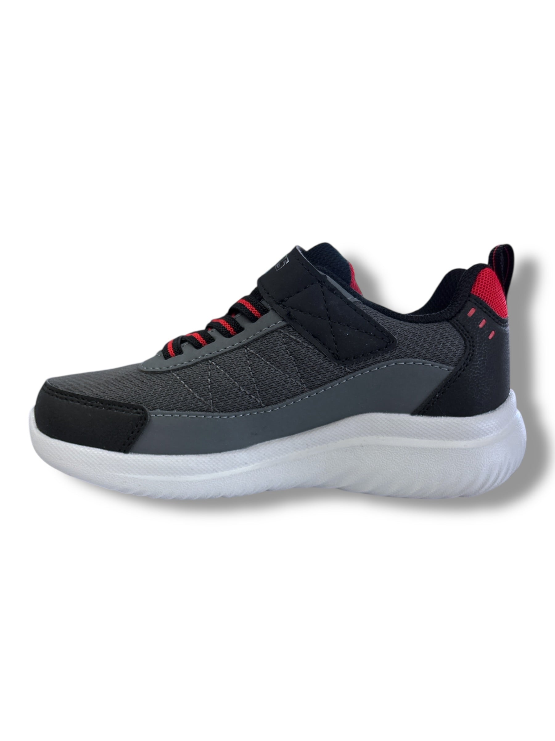Waterproof, lightweight boys’ runner in black and charcoal with red accents — ideal for active kids. Features a secure velcro closure that makes on/off easy, plus a cushioned insole and flexible outsole for everyday comfort and grip.